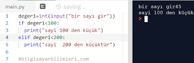 Yukarıda yer alan örneklerde görüldüğü gibi eğer sürekli olarak if kullanılırsa program hata verebilir. İlk örnekte gördüğünüz gibi if komutu iki sonuçta da doğru değeri sağladığı için ekranda hem sayi 100 den küçük hem de sayi 200 den küçük şeklinde sonuçlar çıkmış. İkinci resimde ise elif sayesinde doğru sonucu görüyoruz arkadaşlar.